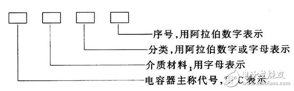 和電阻一樣,電容器的命名也有一定的規(guī)定,在國產(chǎn)電容器中,根據(jù)國家標準GB2470-81的規(guī)定主要包括4個部分,依次表示為:主稱部分、介質(zhì)材料、電容器類別和電容器序號。從下圖中也能很明顯看到這一點,下面一一為大家介紹下。