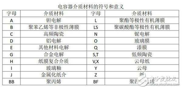 介質(zhì)材料也是用字母來表示,電容器的介質(zhì)種類也比較多,各個字母所代表的材料如下圖所示。