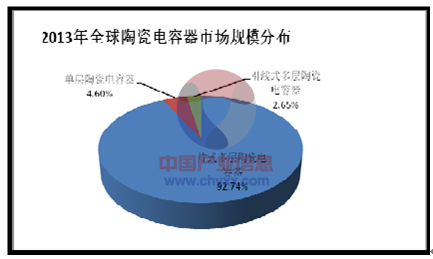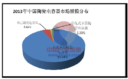 陶瓷電容器可以分為單層陶瓷電容器、片式多層陶瓷電容器及引線式多層陶瓷電容器,由于多層陶瓷電容器具有低ESR,耐高壓、高溫,體積小、電容量范圍寬等特點,在成本和性能上都占據(jù)相當優(yōu)勢,下游應用較為廣泛,其市場規(guī)模約占整個陶瓷電容器的93%,2013 年各類別陶瓷電容器市場規(guī)模分布情況如下: