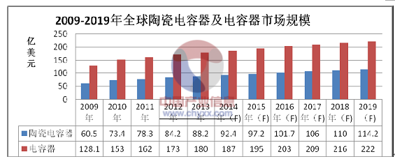 電容器作為主要的電子元件之一,其產(chǎn)量約占整個電子元件的40%。中國產(chǎn)業(yè)信息網(wǎng)發(fā)布的《2014-2019年中國電容器市場分析預測及投資戰(zhàn)略咨詢報告》顯示:近年來,隨著下游市場的發(fā)展,電容器需求呈現(xiàn)出整體上升態(tài)勢,2013 年全球電容器市場規(guī)模達到了180 億美元,其中中國達到了773.5 億元,預計2019 年全球?qū)⑦_到222 億美元,其中中國為1,101.6 億元。而陶瓷電容器作為電容器中使用最廣、用量最大的類別,隨著技術(shù)不斷進步、性能不斷提高,其下游應用領(lǐng)域也正不斷擴大,市場規(guī)模占比從2006 年的不到40%上升至2013 年的49%左右。