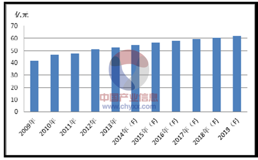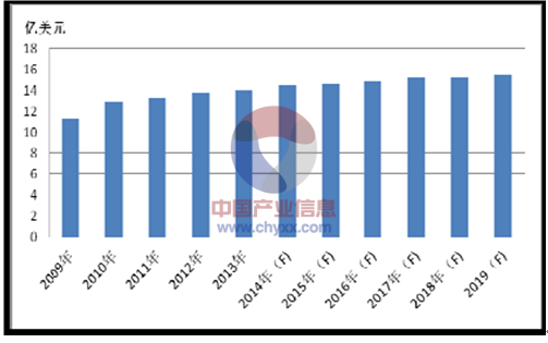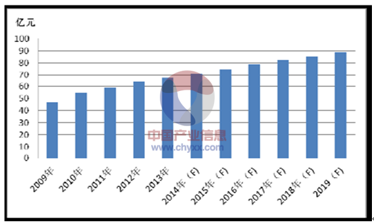2009 年中國工業(yè)用MLCC 產(chǎn)品市場規(guī)模達到36.6 億元,2010 年增長至44.8億元,2011 年、2012 年分別達到了49.2 億元、55.6 億元,2013 年為61.1 億元,2014 年中國工業(yè)用MLCC 產(chǎn)品市場規(guī)模預計將達到65.4 億元。