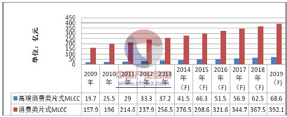 2009-2019 年中國消費類、高端消費類MLCC 產(chǎn)品市場規(guī)模發(fā)展趨勢與預測