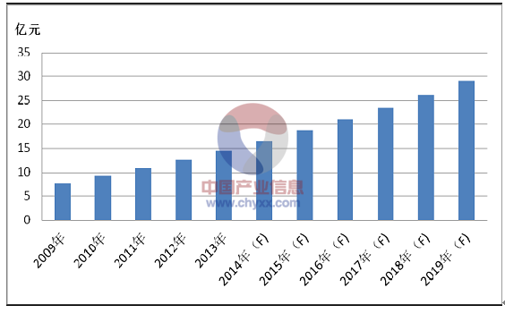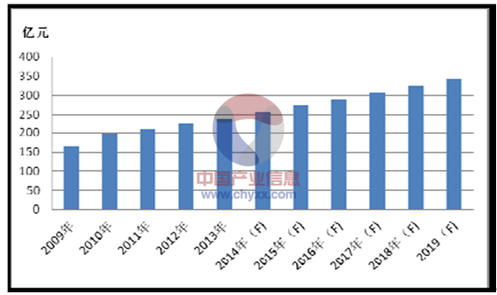 中國作為全球主要的消費性電子產(chǎn)品生產(chǎn)基地,已成為全球陶瓷電容器生產(chǎn)大國和消費大國,產(chǎn)銷量位居全球前列。從MLCC 產(chǎn)品的市場需求來看,其主要應用在航天、航空、船艦、兵器、電子對抗等軍工類產(chǎn)品,系統(tǒng)通訊設(shè)備、工業(yè)控制設(shè)備、醫(yī)療電子設(shè)備、汽車電子、精密儀表儀器、石油勘探設(shè)備、軌道交通等工業(yè)類產(chǎn)品及筆記本電腦、數(shù)碼相機、手機、錄音錄像設(shè)備等消費類產(chǎn)品。2009 年中國MLCC 產(chǎn)品市場規(guī)模達到225.9 億元,2013 年上升至359.7 億元,2014 年中國MLCC 產(chǎn)品市場規(guī)模預計為387.4 億元。