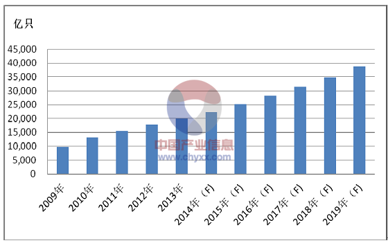 而對于MLCC 需求數(shù)量方面,2012 年全球MLCC 市場需求量達到了26,000億只,2013 年增長至29,100 億只,2014 年預計將達到32,500 億只。