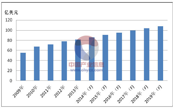 2009 年受全球金融危機的影響,全球MLCC 產(chǎn)品市場規(guī)模有所下降,為55.2億美元,隨著經(jīng)濟形勢的好轉(zhuǎn),下游用戶消費的回升,2010 年上升為67.3 億美元,2013 年為81.8 億美元,2014 年全球MLCC 產(chǎn)品市場規(guī)模預計為86 億美元。