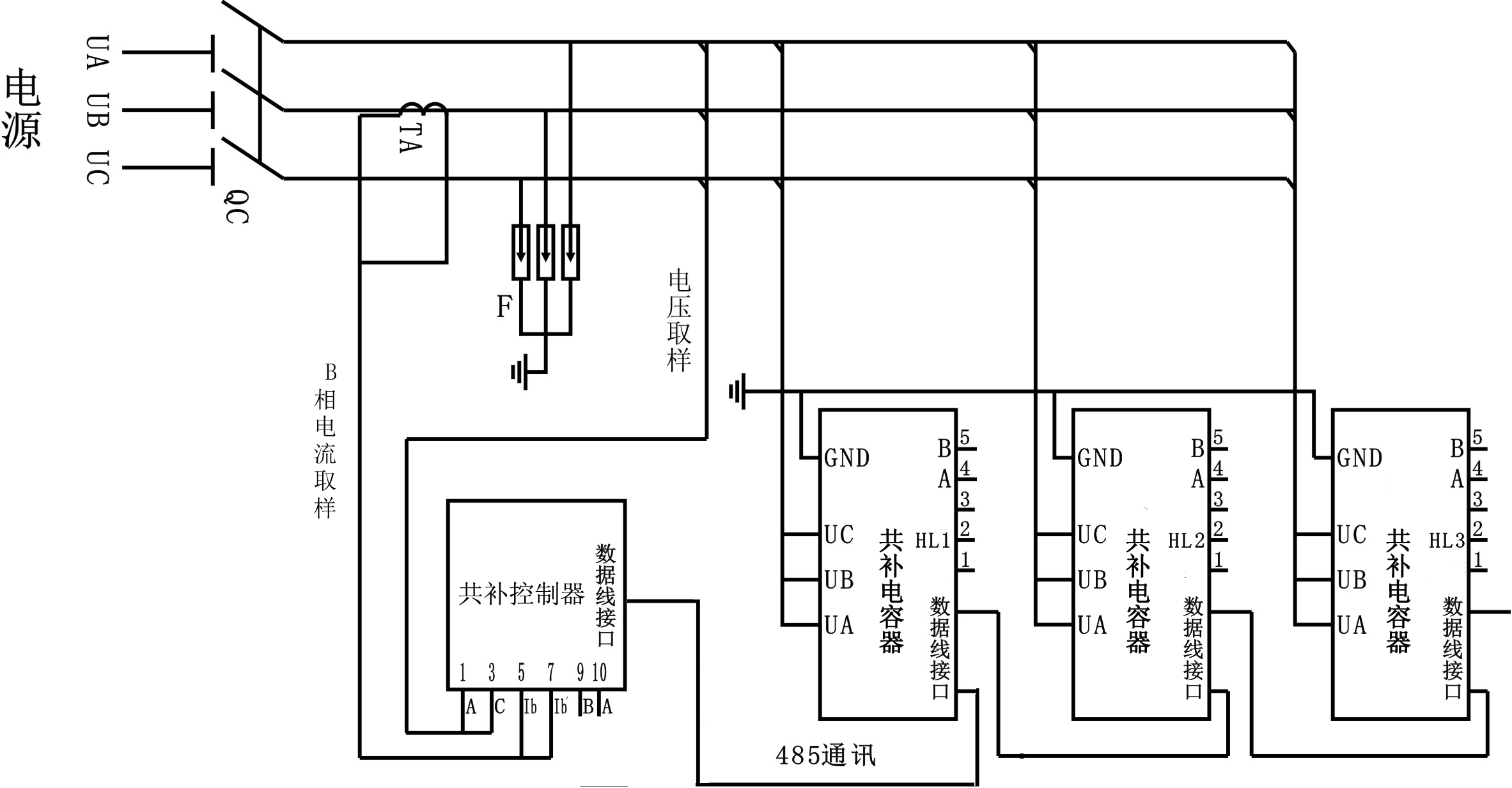 2)采用RS485通信控制方式,混補(bǔ)控制器最多可同時(shí)控制20只共補(bǔ)電容器和10只分補(bǔ)電容器,共補(bǔ)控制器最多可同時(shí)控制32臺(tái)共補(bǔ)電容器。